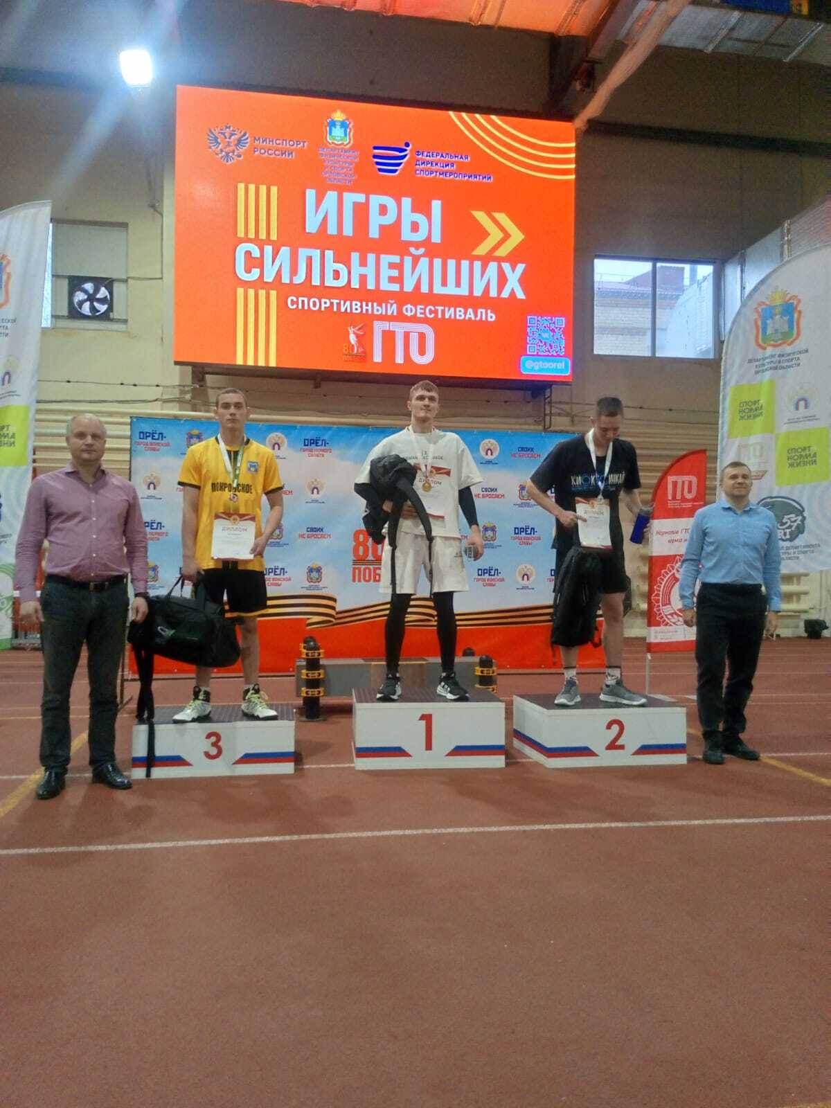 м9 декабря на базе легкоатлетического манежа "Училища олимпийского резерва" в г. Орёл прошел Фестиваль ВФСК "Готов к труду и обороне" (ГТО) "Игры сильнейших" среди девушек и юношей 6-7 ступени (16-19 лет). В Фестивале участвовали 102 девушки и 100 юношей Орловской области.Центр тестирования Покровского района представляли следующие участники: Меркулов Артём (обучающийся МБОУ "Покровская средняя школа"), Решетникова Виктория (обучающаяся МБОУ"Покровский лицей "), Фурса Андрей, Черников Даниил, Устинов Артём (обучающиеся БПОУ ОО "Покровский техникум"). Все наши ребята показали хорошие результаты. По итогам Фестиваля Меркулов Артём занял 3 место (отмечен грамотой, медалью и ценным призом). Всем участникам огромное спасибо! Вы молодцы! Идите смело от ступеньки к ступеньке и в дальнейшем победы будут за вами.